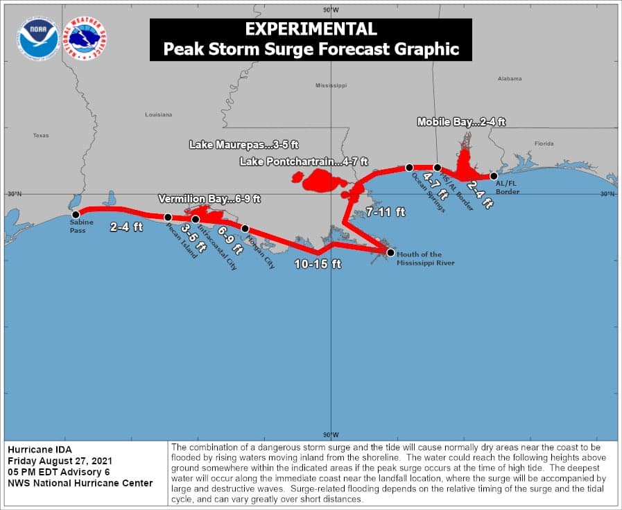 L'impact avec la Louisiane était prévu en soirée et nuit de dimanche 29 à lundi 30 août avec une marée de tempête dépassant les 3,5 à 4m, des rafales de vent pouvant dépasser les 250km/h et des cumuls de précipitations de plus de 500mm en 24h.