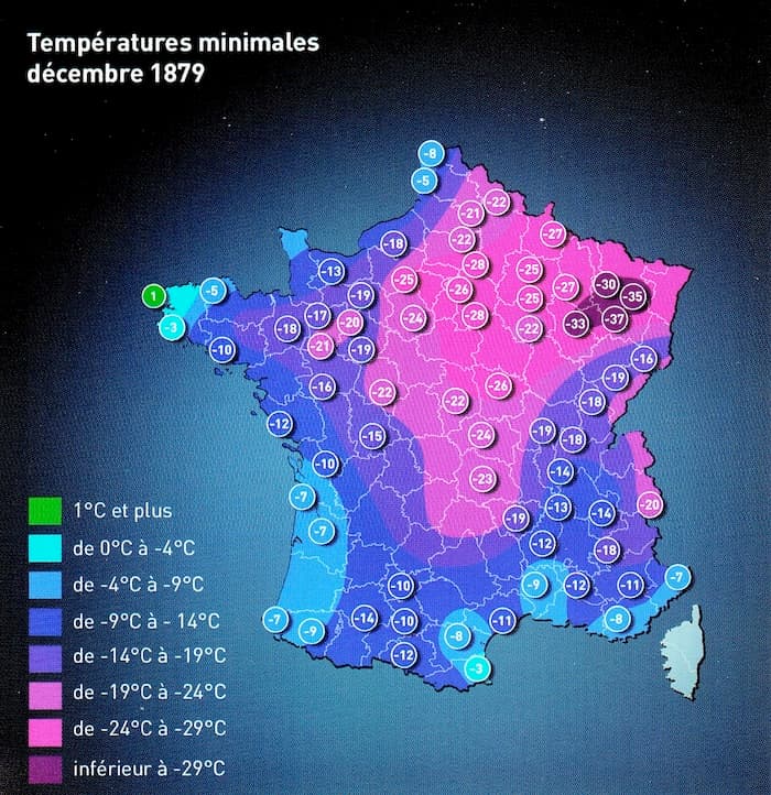 Températures minimales mesurées au cours du mois de décembre 1879 - Météo Villes, livre "Y'a plus de saison"