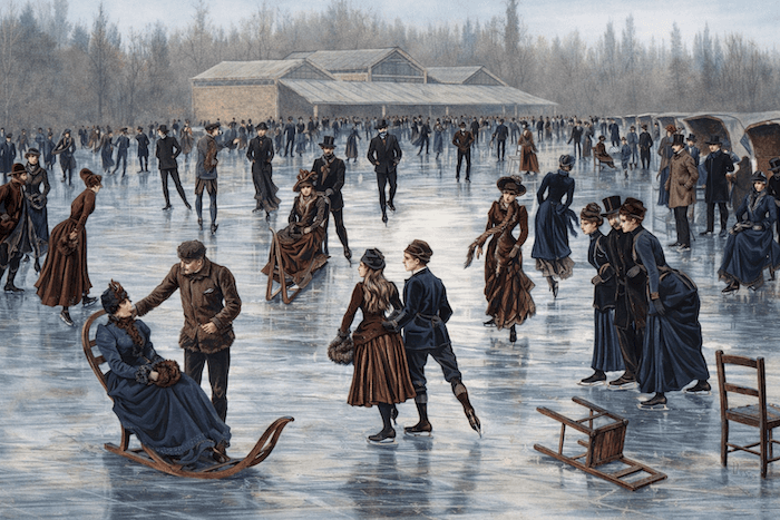 Comme toujours, un contraste saisissant se dessine entre ceux qui apprécient le froid et ceux qui le subissent.  Ceux qui en profitent sont sans surprise issus de la petite ou de la haute bourgeoisie.  Le patinage est une activité populaire, et l’étang du Bois de Boulogne à Paris est particulièrement fréquenté.  On y pratique également le fauteuil-traineau et la chaise à patins, traditions qui perdureront jusqu’aux années 1960. Pour certains, c’est l’occasion rêvée de se faire remarquer. Les dames arborent de longues robes d’hiver, de manteaux de fourrures et des chapeaux extravagants. Chuter serait donc une gêne considérable, car se relever serait une épreuve. Les hommes, quant à eux, patinent généralement en costume sobre et portent tous un chapeau.