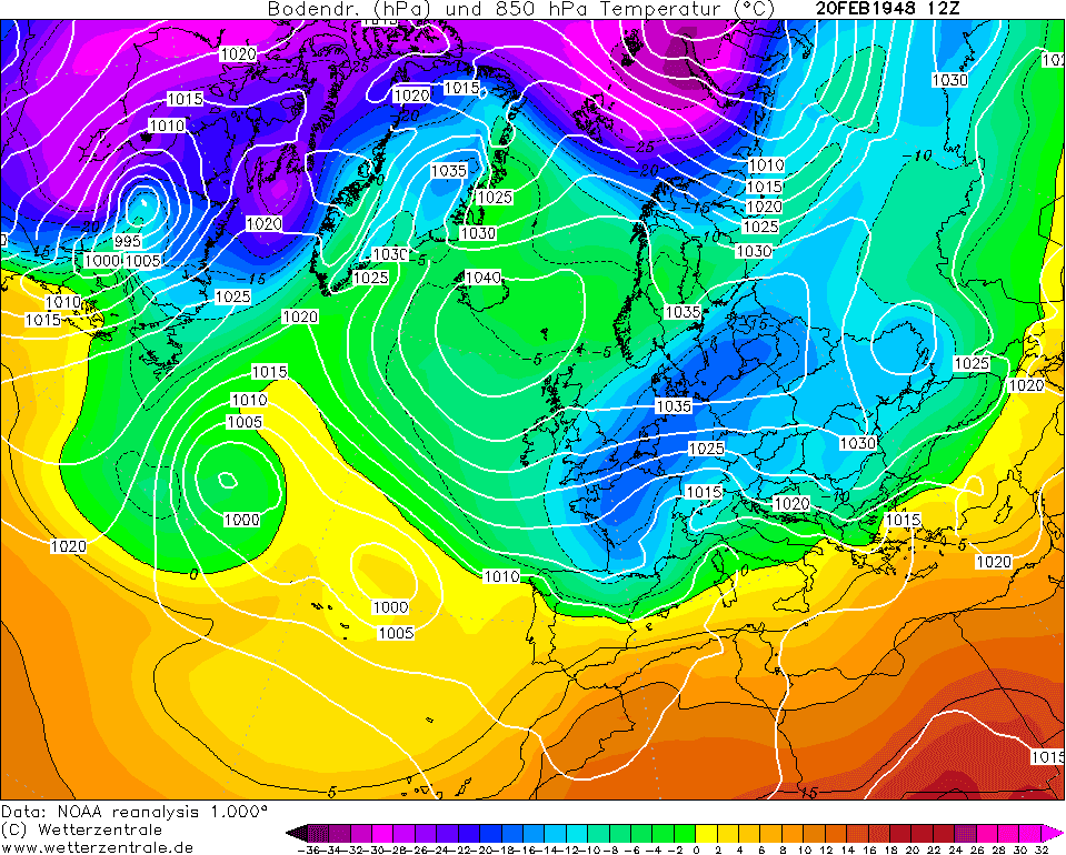 Carte NOAA de la température à 850 hPa, en date du 20 février 1948