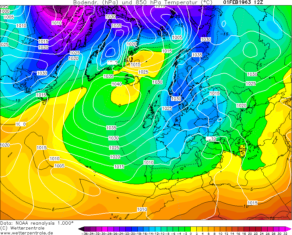 Carte NOAA de la température à 850 hPa, en date du 1er février 1963.