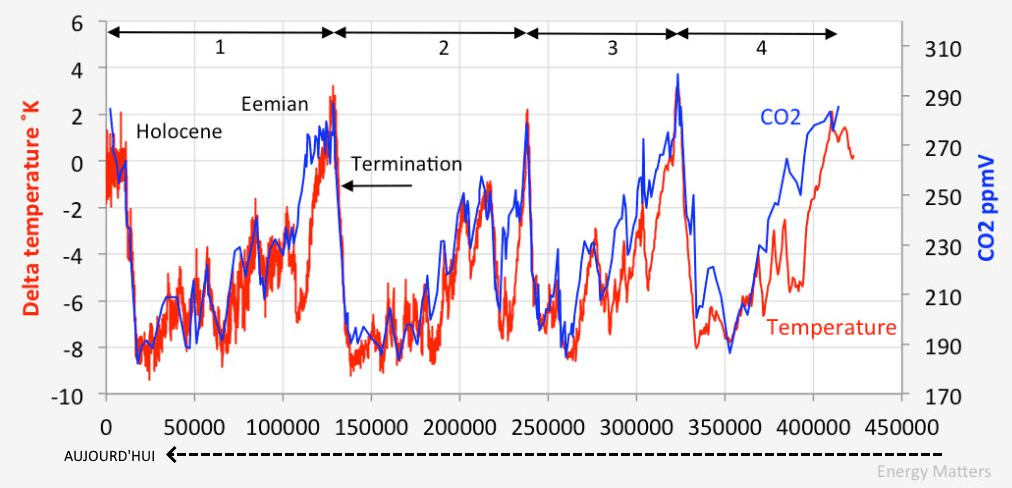 Évolution des taux de CO2 et de la température sur Terre de -450.000 ans à nos jours - via Energy Matters