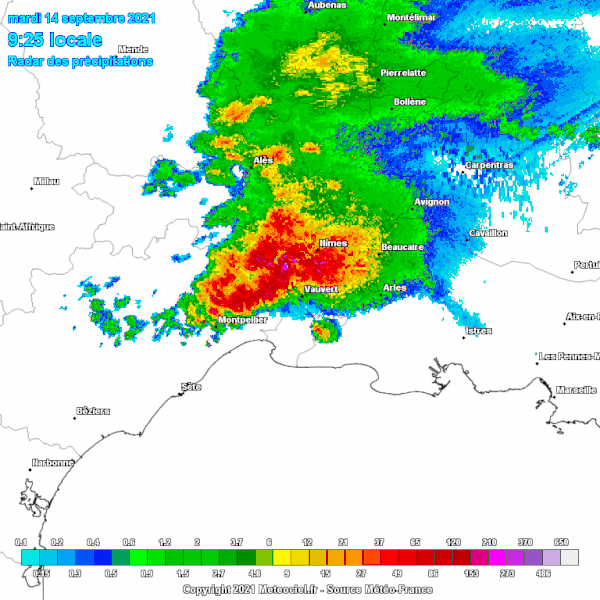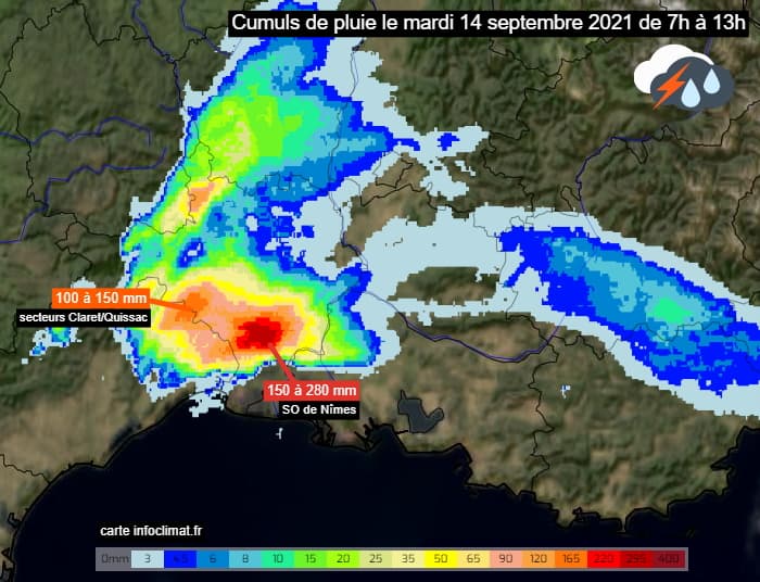 Des orages diluviens se sont déclenchés en matinée du mardi 14 septembre 2021 sur les départements de l'Hérault et du Gard. Ils se sont attardés sur le sud de la région de Nîmes où les inondations importantes ont nécessité une vigilance rouge.