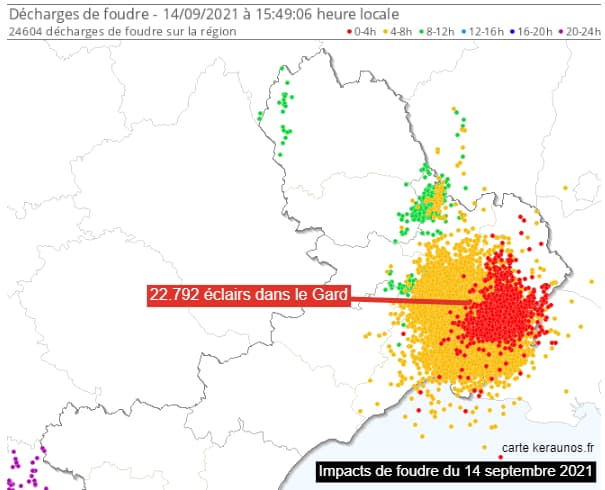 Ces orages extrêmement pluvieux se sont également accompagnés d'une activité électrique remarquablement marquée. Le seul département du Gard a comptabilisé 22.792 éclairs durant la matinée et le début d'après-midi du mardi 14 septembre 2021, un chiffre spectaculaire ! À elle seule, la ville de Nîmes en comptabilise 2.215 !