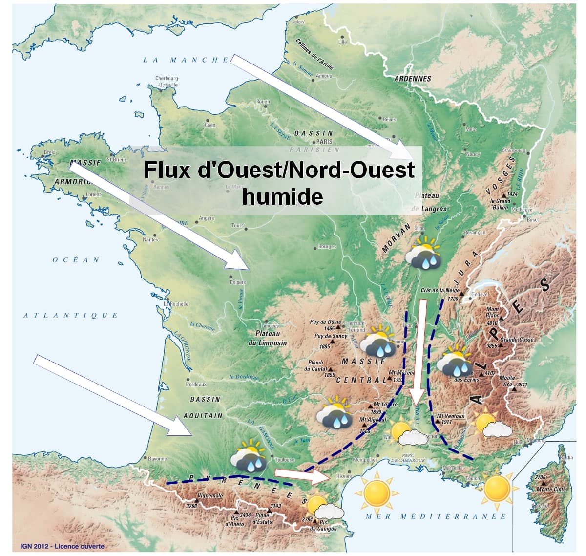 Si le reste du pays est plus facilement influencé par la circulation océanique (flux d’Ouest/Nord-Ouest perturbé), la méditerranée est « fermée » et protégée dans ce type de situation. Les reliefs bloquent en effet l’humidité contre les versants les plus à l’Ouest/Nord-Ouest et la masse d’air est asséchée en s’écoulant vers le Sud-Est du pays.