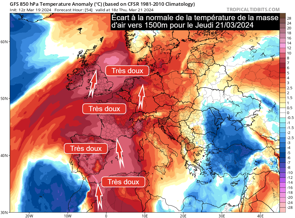 Une anomalie dépressionnaire se positionne au large du Portugal cette semaine, contribuant à un flux méridien faisant remonter de l'air très doux sur la France, jusqu'en Angleterre et en Mer du Nord. Dans les prochains jours, les températures de la masse d'air seront souvent 4 à 8°C supérieures aux normales de saison au dessus de l'hexagone. Cela se traduira au sol avec des valeurs très douces du nord au sud, à la faveur de conditions globalement lumineuses jusqu'au vendredi 22 mars 2024.