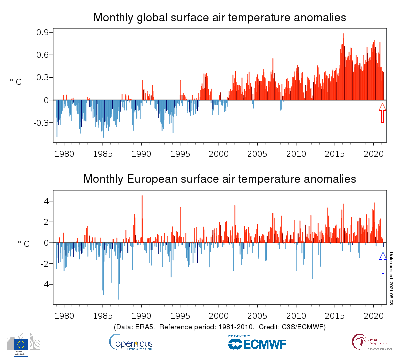 Anomalies thermiques sur l’Europe et le Monde durant le mois d’avril 2021 – Copernicus
