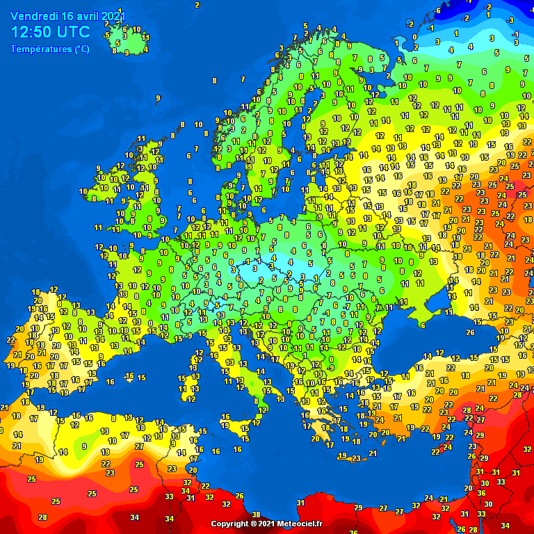 Contrastes de températures entre Est et Ouest de l’Europe le 16 avril 2021 – Météociel.fr