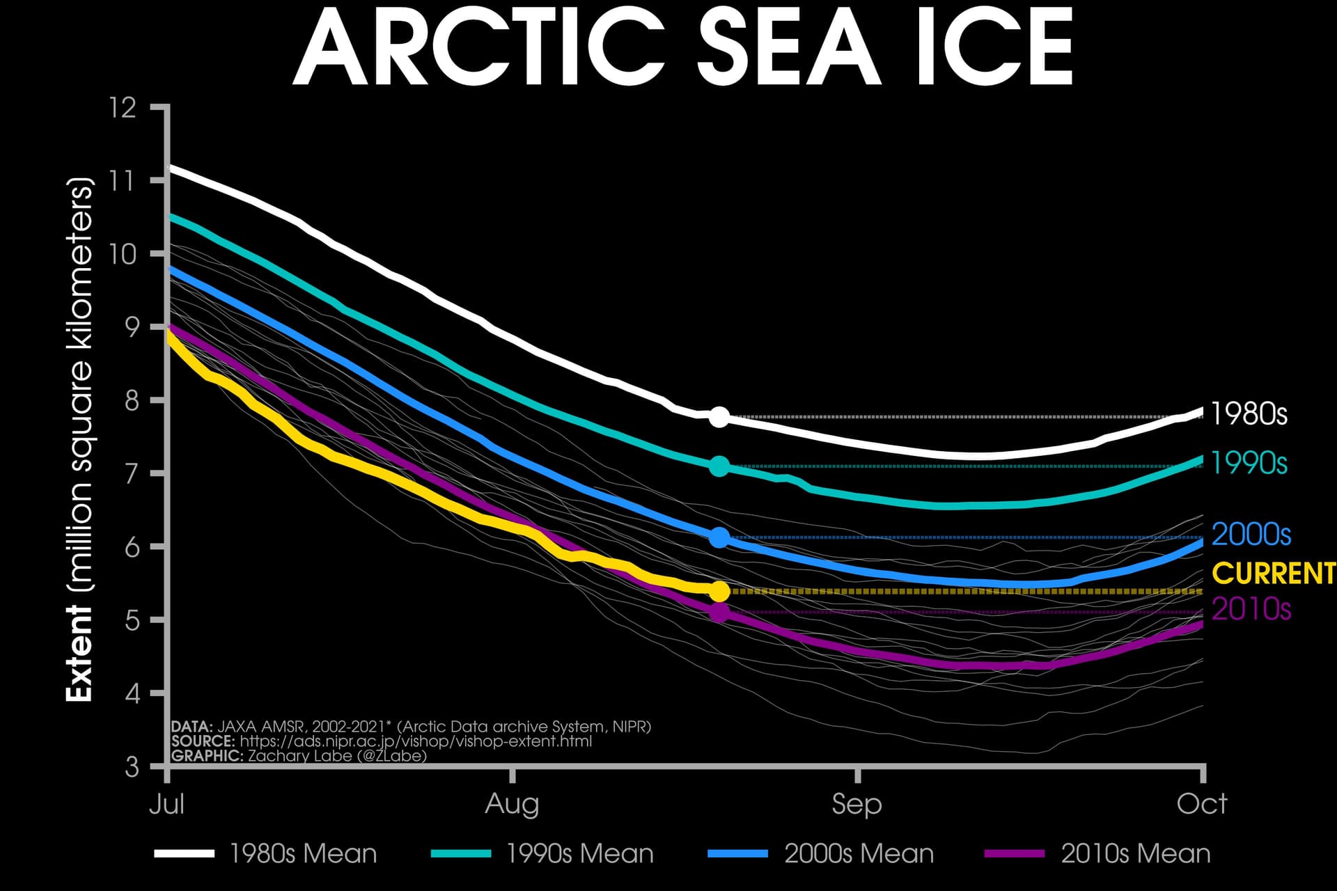 Minimum annuel de l'extension des glaces arctiques depuis le début des années 2000 et moyennes décennales depuis 1980 – Zachary labe