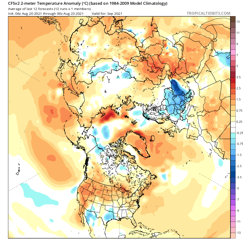 Anomalies de températures prévues sur le Pôle Nord entre septembre 2021 et mars 2022 - Modèle CFS via TropicalTidBits