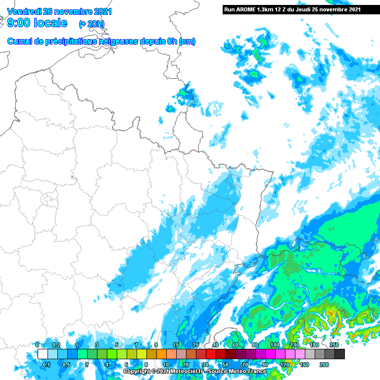 Cumuls de neige envisagés au nord-est du vendredi 26 novembre au soir au lendemain matin - via meteociel.fr