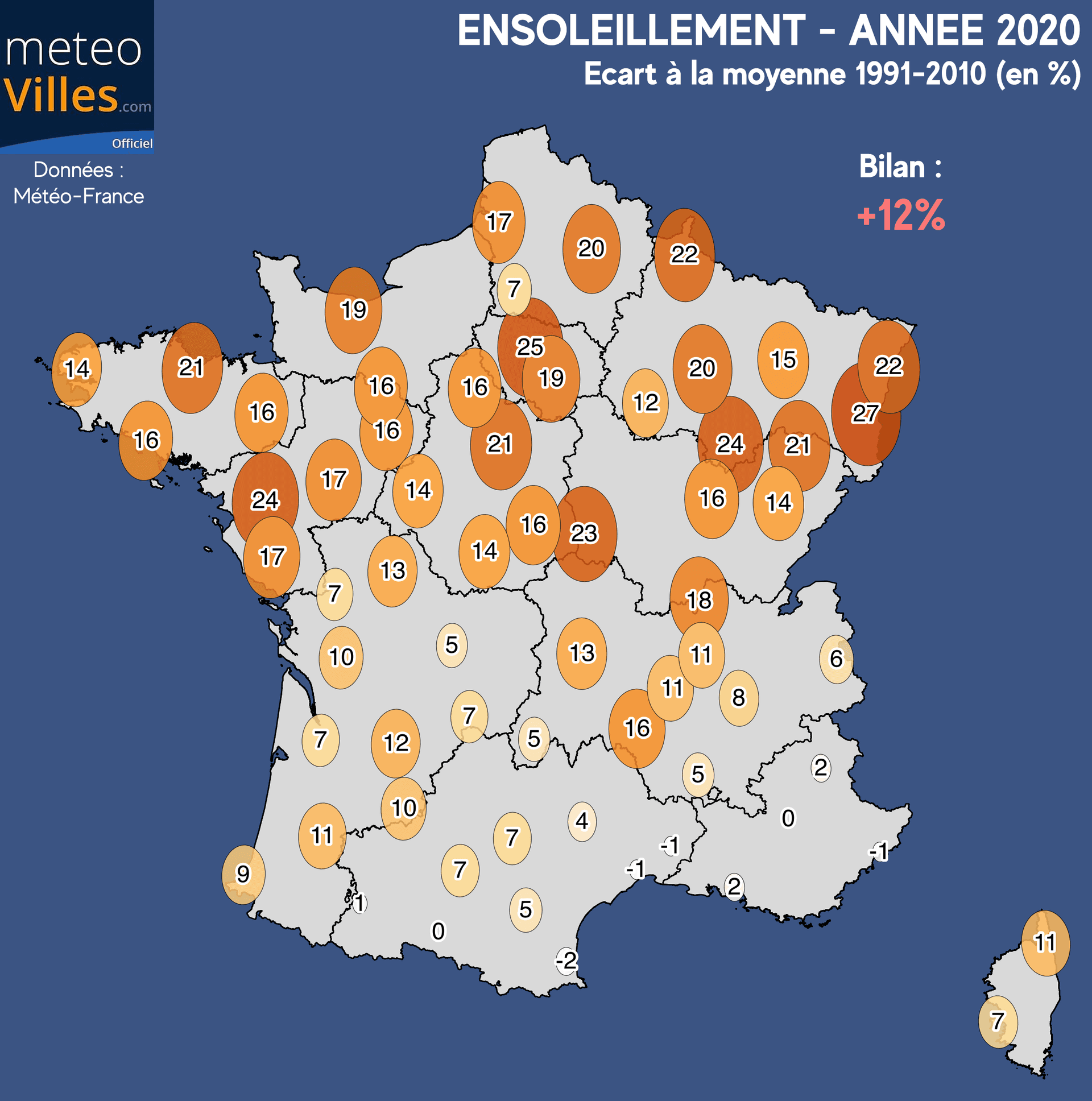 Même si nous n'avons pas pu en profiter pleinement en raison des mesures sanitaires de confinement, cette année 2020 a également été assez ensoleillée, terminant sur un bilan national de +12% sur notre panel de stations.. Seulement 3 des 12 mois de l'année ont présenté un déficit d'ensoleillement : il s'agissait des mois de juin (-7%), octobre (-25%) mais aussi du récent mois de décembre écoulé (-22%).