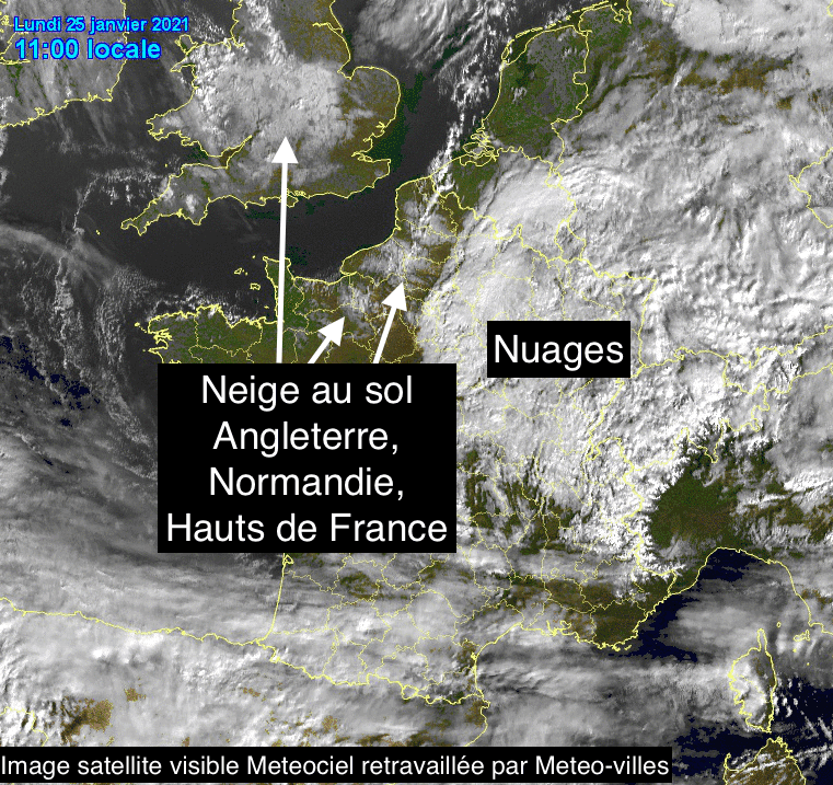 Alors que le soleil revient peu à peu sur la moitié Nord, les chutes de neige de la veille sont visibles par satellite, notamment entre l’intérieur de la Normandie, des Hauts-de-France et sur l’Angleterre. Cette couche neigeuse font peu à peu au fil des heures mais devrait persister plus longuement sur les reliefs normands.