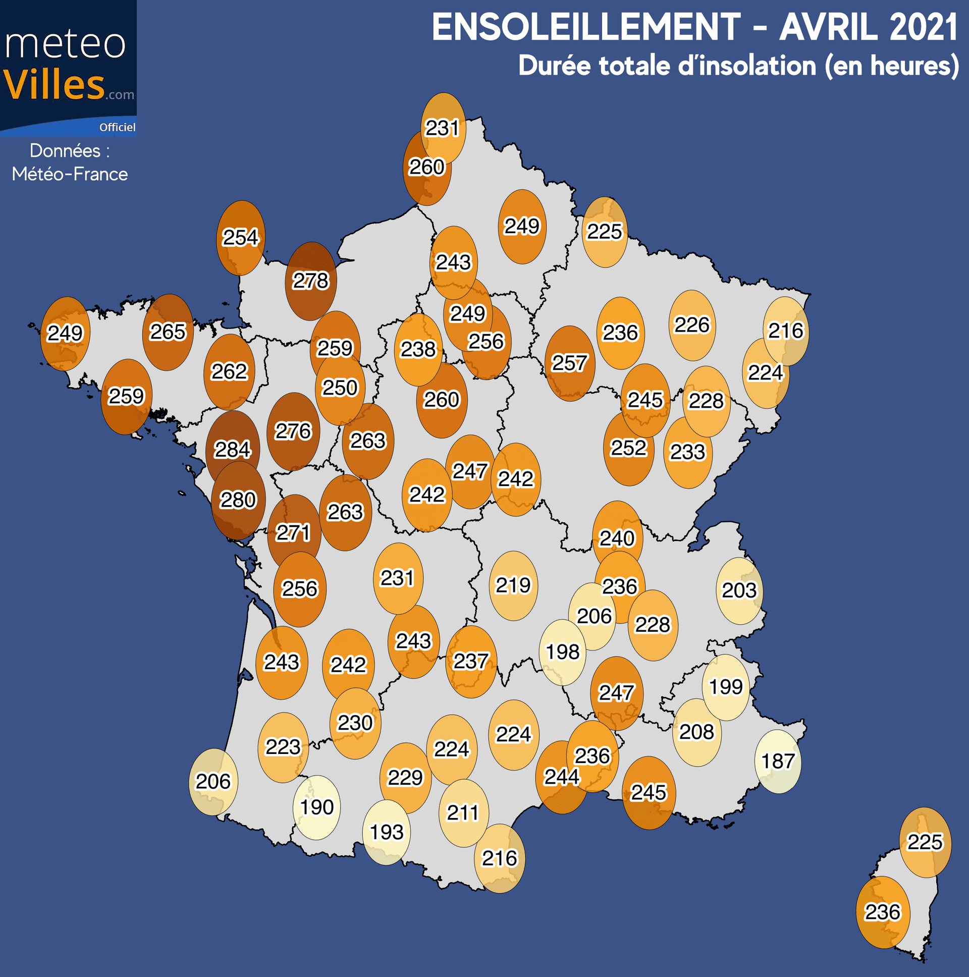 Il fallait en effet se rendre dans la partie Nord et surtout Nord-Ouest du territoire pour cumuler plus de 250 heures de soleil en ce mois d'avril (jusqu'à 271h à Niort, 276h à Angers, 278h à Caen, 280h à La Roche-Sur-Yon, 284h à Nantes et donc 296h à Dinard, non représenté ici sur notre carte). Paris a cumulé 249 heures de soleil sur sa station du Parc Montsouris.