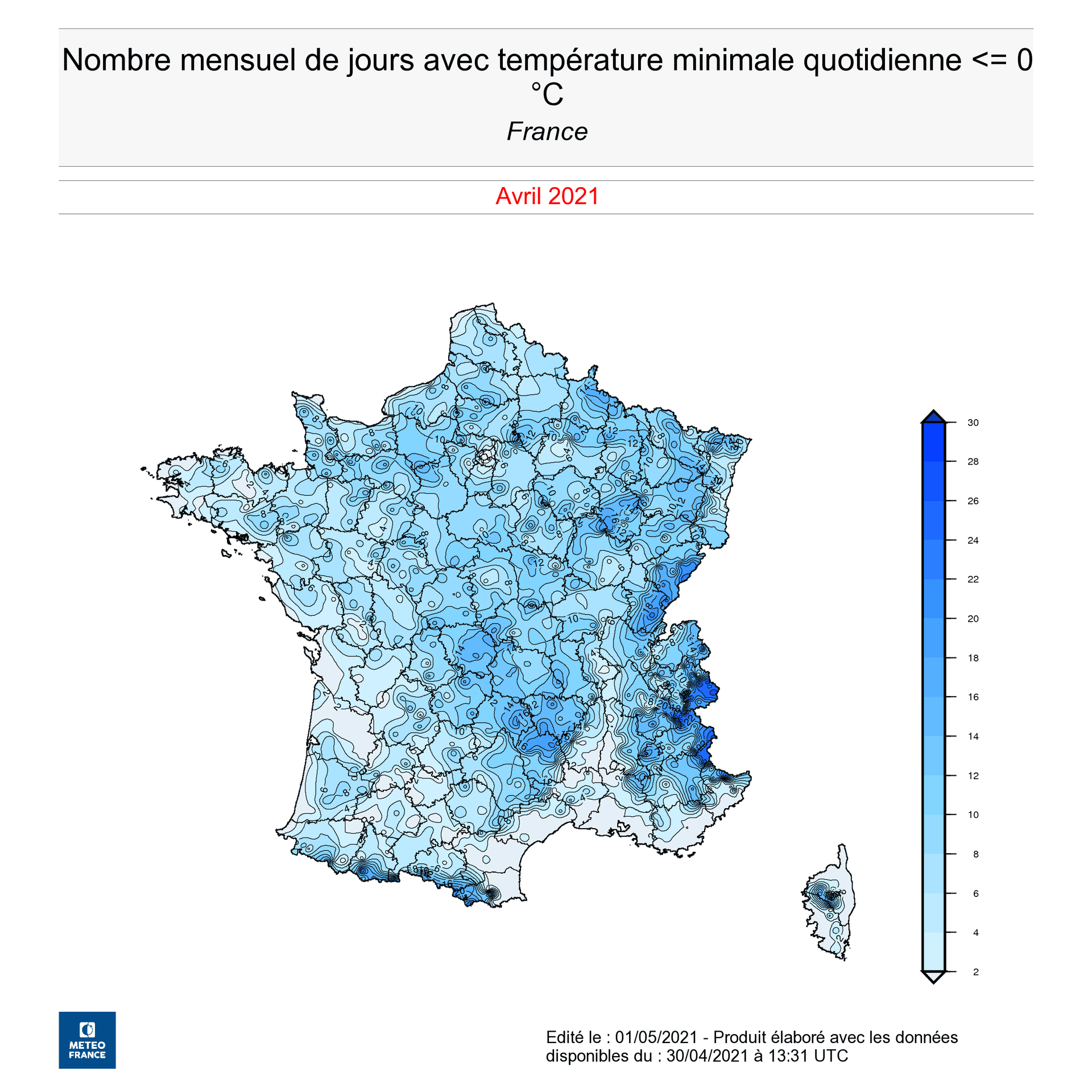 En effet, avec une anomalie de -1.6°C, les températures minimales de ce mois d'avril 2021 ont été les plus basses depuis 35 ans (avril 1986, considéré par ailleurs comme le mois d'avril le plus froid depuis l'après-guerre) en raison d'un flux continental sensible et permettant un dégagement du ciel la nuit (phénomène dit de "rayonnement nocturne"). Ceci s'est matérialisé par des gelées très fréquentes en de nombreuses régions du territoire, souvent plus d'un jour sur trois sur la moitié Nord.