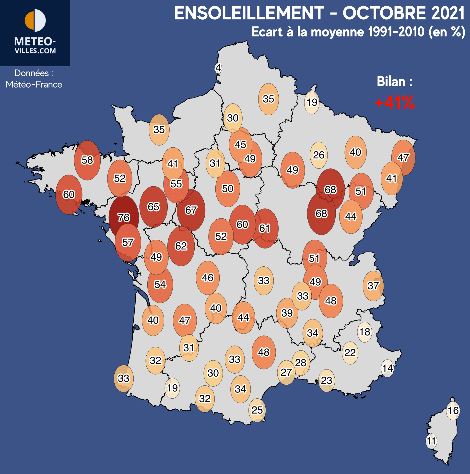 Indiqué précédemment, ce sont les conditions anticycloniques qui ont régné sur notre pays au cours du mois d'octobre. Les perturbations océaniques ayant été assez rares, et le flux plutôt sec (nuages bas et brouillards limités), le soleil s'est dont manifesté de manière remarquable voire exceptionnelle sur certaines régions. Ceci s'en ressent à l'échelle nationale, puisque l'excédent atteint +41% sur notre panel de stations.