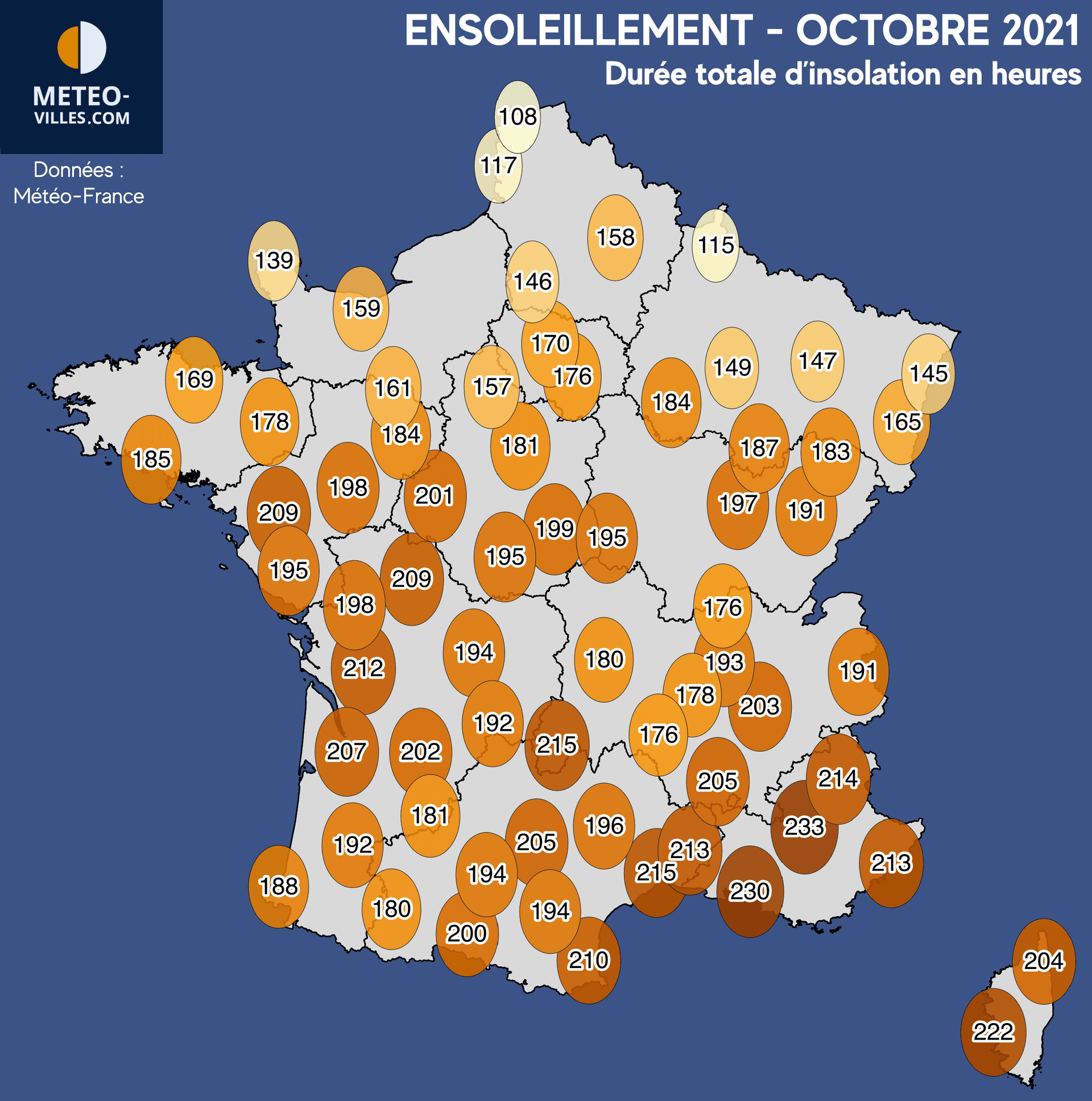 Comme souvent, les valeurs les plus élevées en termes de durée cumulée d'insolation ont été observées près de la méditerranée, avec plus de 220h (222h à Ajaccio, 230h à Marseille-Marignane et 233h pour Saint-Auban, maximum de notre panel). Mais l'écart avec le reste du pays se montre limité, puisque d'une manière générale, l'ensoleillement est compris entre 180h et 210h sur toutes les villes situées au sud de la Seine. Certaines villes de la moitié Nord sont même parvenu a dépasser le seuil fatidique des 200h pour la première fois en octobre (exemple de Poitiers et de Nantes avec 209h).