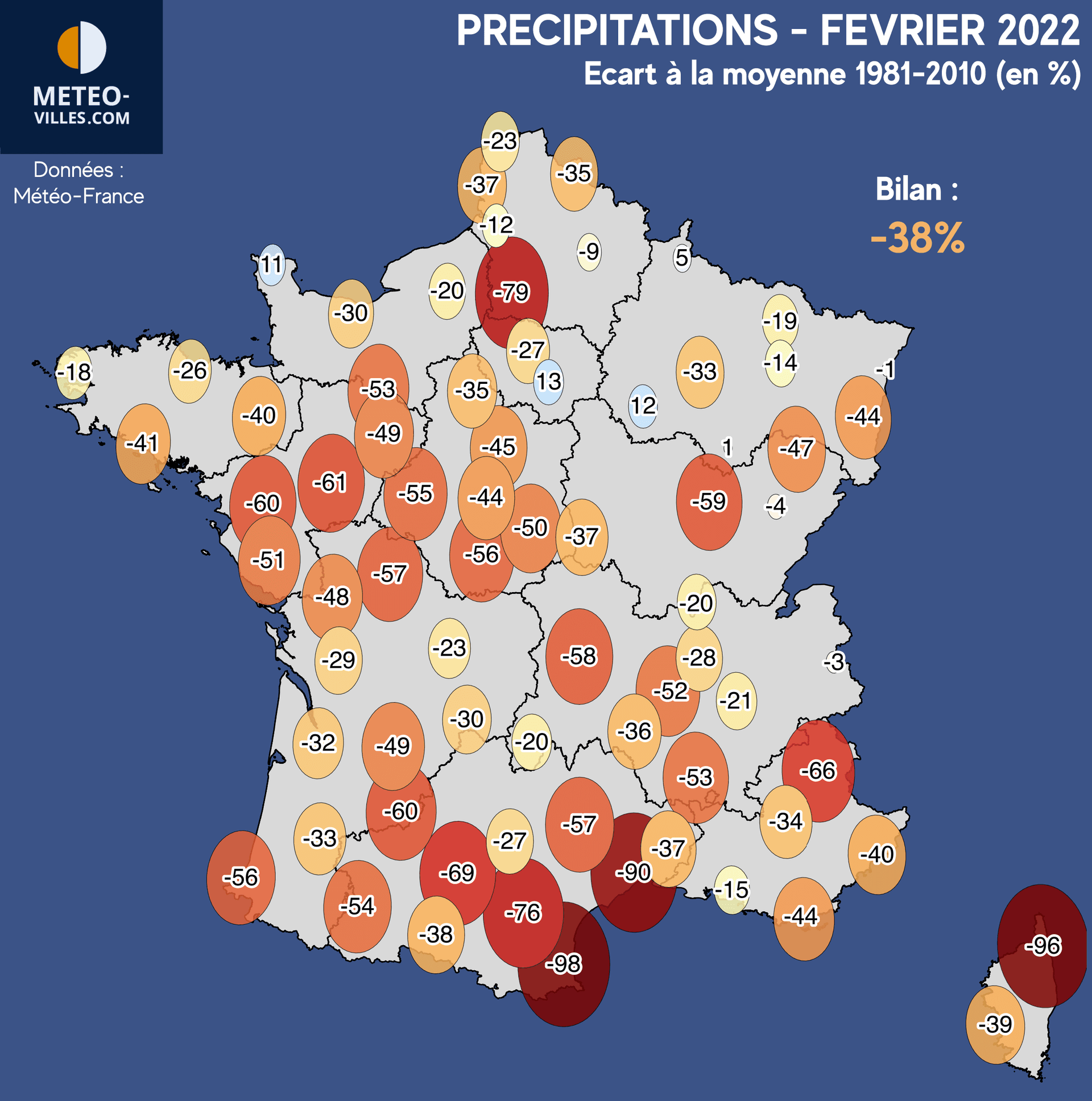 Partout ailleurs, les pluies ont été bien limitées voire quasi-inexistantes au cours du mois. Sur les Pays de la Loire ou encore en région Centre-Val-de-Loire, ce déficit atteint -40 à -60%. Il atteint les -70% le long de la Garonne, et dépasse même les -90% sur le Languedoc-Roussillon ainsi que la façade orientale de la Corse (-90%C à Montpellier, -96% à Bastia, -98% à Perpignan), où la sécheresse continue de s'aggraver après un mois de janvier déjà exceptionnellement aride. Pour la capitale, le bilan est de -27% au Parc Montsouris.