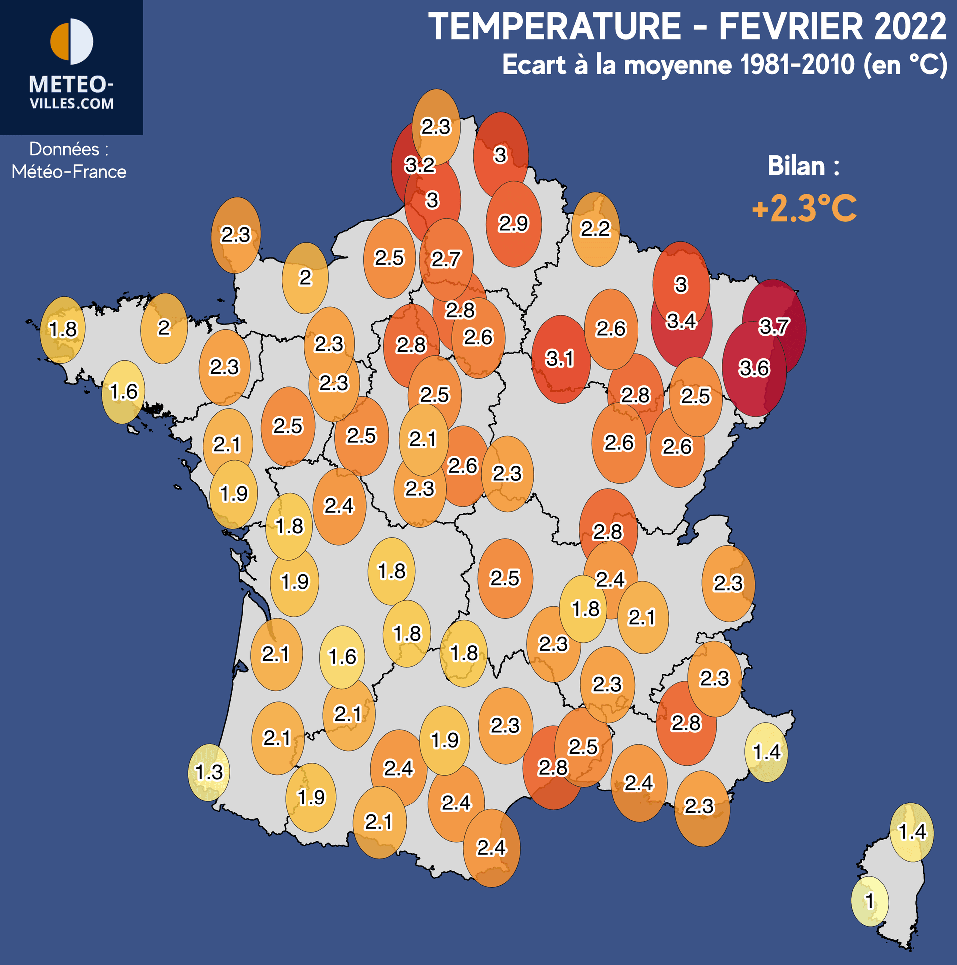 L'ensemble des villes de notre panel de stations a terminé ce mois de février 2022 sur un excédent égal ou supérieure à +1°C. Les excédents les plus faibles ont été observés sur la façade Atlantique, sur le Limousin, en Côte d'Azur ou encore en Corse (+1.0°C à Ajaccio, +1.3°C à Biarritz, +1.4°C à Nice et Bastia, +1.6°C à Lorient et Bergerac).
