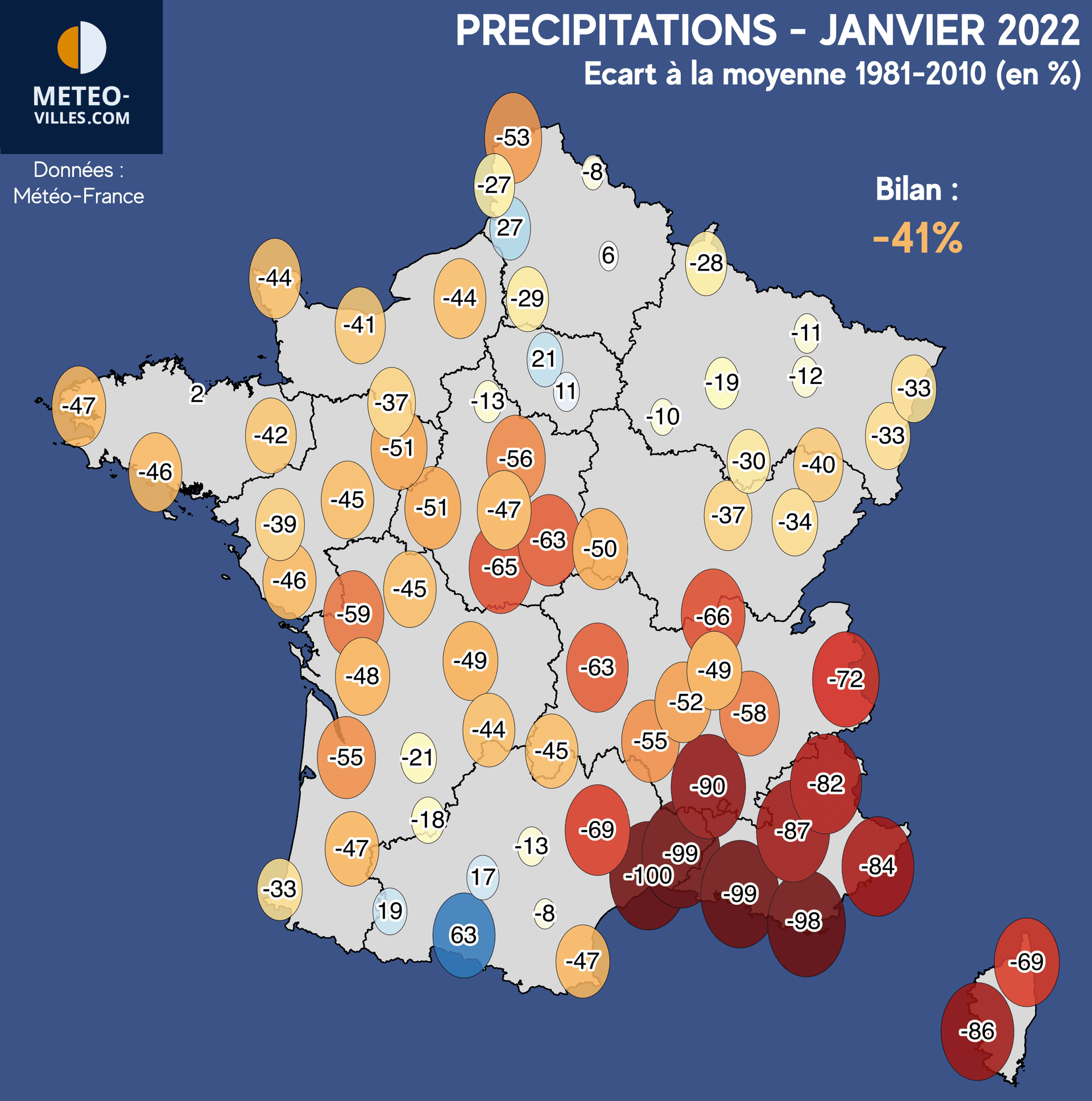Avec de telles conditions anticycloniques, les perturbations océaniques ont été inexistantes, et les pluies bien rares. Au final, ce mois de janvier 2022 s'est bouclé sur un important déficit pluviométrique, atteignant -41% sur notre panel de stations.