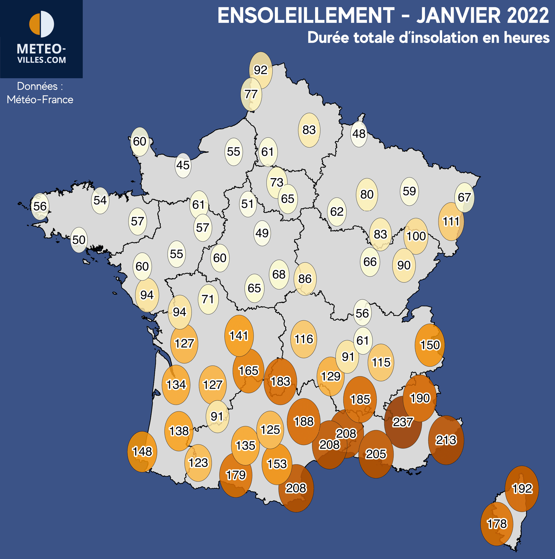 Un contraste saisissant avec les valeurs observées dans la moitié Nord, là où les nuages bas ont été bien tenaces. Exceptés la Franche-Comté, le Haut-Rhin ou encore les Hauts-de-France, les régions situées au nord de la Loire n'ont pu profiter que de 50 à 60 heures de soleil en moyenne durant ce mois de janvier. Pour les valeurs les plus basses, notons 51 heures à Chartres, 50h à Lorient, 49h à Orléans, 48h à Charleville-Mézières, et un petit 45h pour la station de Caen-Carpiquet.