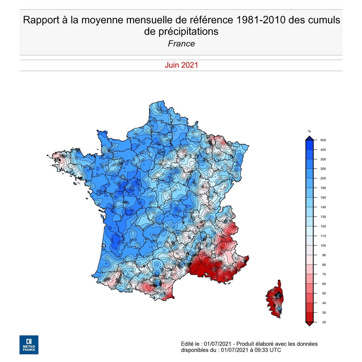 Comme à chaque début de mois, nous vous proposons un bilan climatologique du mois écoulé. Place donc au bilan cartographié du mois de JUIN 2021 en termes de température, pluviométrie et ensoleillement sur un panel de 73 stations*.