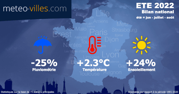 Outre le caractère exceptionnellement chaud de cet été 2022, l'autre fait aggravant a été celui d'une absence notable de pluie. Avec un déficit pluviométrique de -25% à l'échelle national,  il s'agit d'un été entrant au niveau du 10e rang des plus secs depuis le début de la série statistique en 1959, et le plus sec observé depuis 2016.