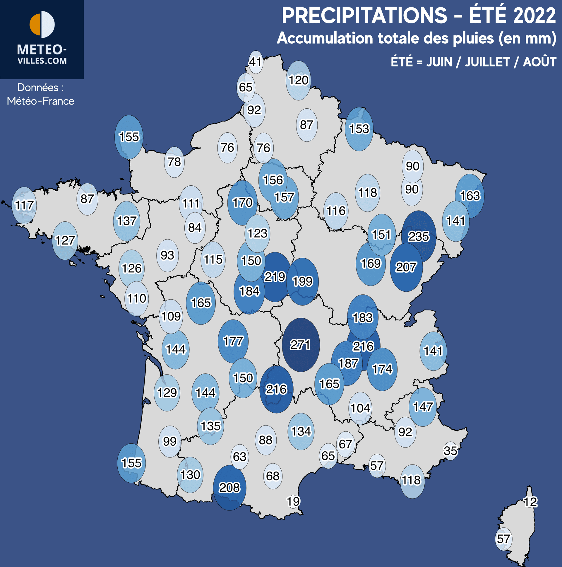 Traduit en termes de cumul, les régions ayant récolté le moins de précipitations au cours de cet été 2022 sont situées sur le pourtour Méditerranéen, dans le Midi-Toulousain, en Pays-de-la-Loire, Normandie ainsi que sur les Hauts-de-France. Sur ces secteurs, nous n'avons pas dépassé les 100mm cumulés sur ces trois mois. Sur certaines villes, ce sont même bien moins de 50mm qui sont tombés cet été : notons 41mm à Calais, 35mm à Nice, 19mm à Perpignan, et un minimum de seulement 12mm à Bastia.