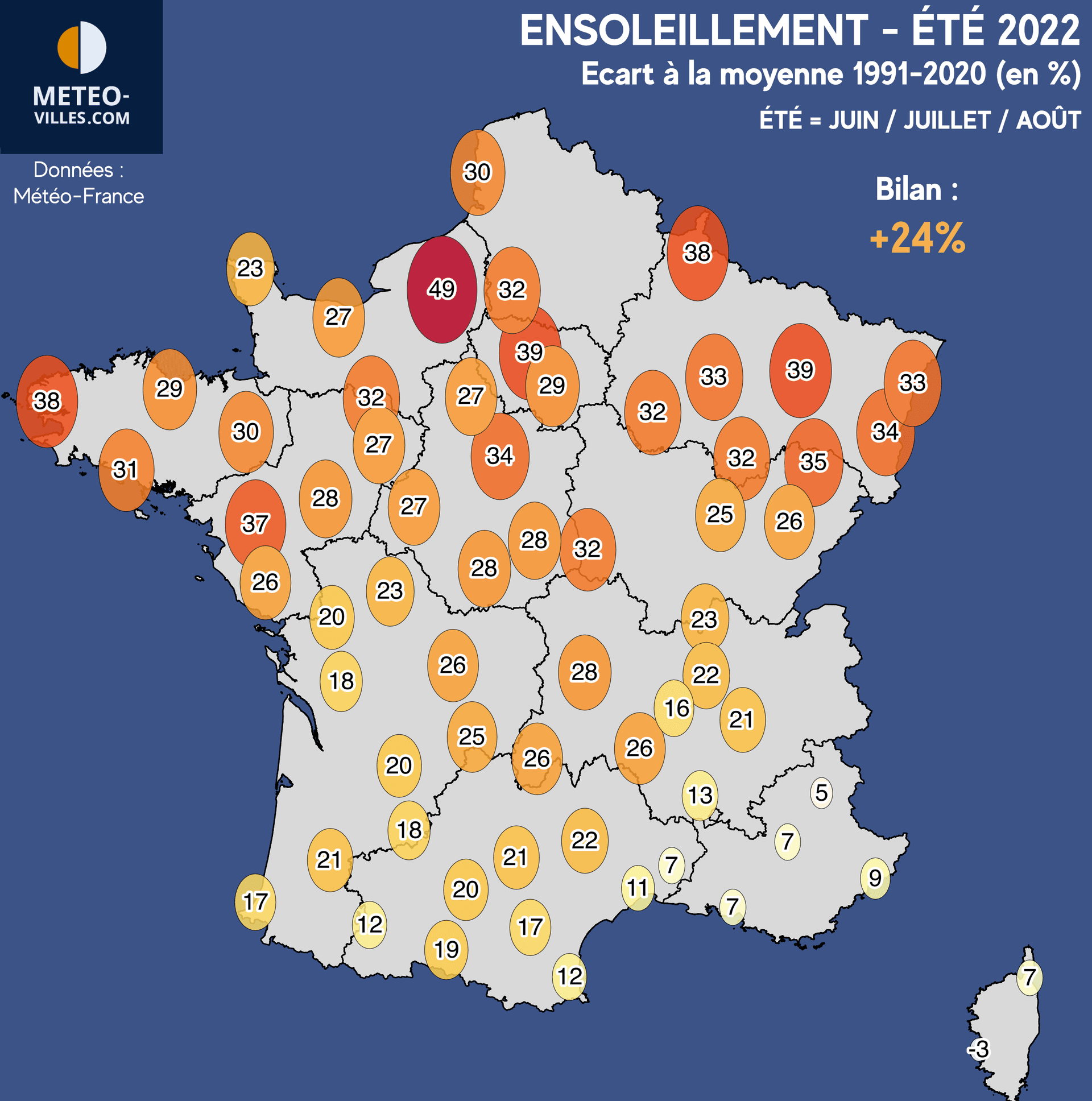 Les conditions à dominante anticyclonique qui surviennent de façon très récurrente en cette année 2022 se sont poursuivies durant cet été météorologique. De ce fait, le soleil s'est montré omniprésent sur une bonne partie du territoire Français, bien au delà d'un été "normal". Au final, c'est un excédent de +24% à l'échelle nationale qui est à noter sur notre panel de stations météorologiques en termes d'ensoleillement.