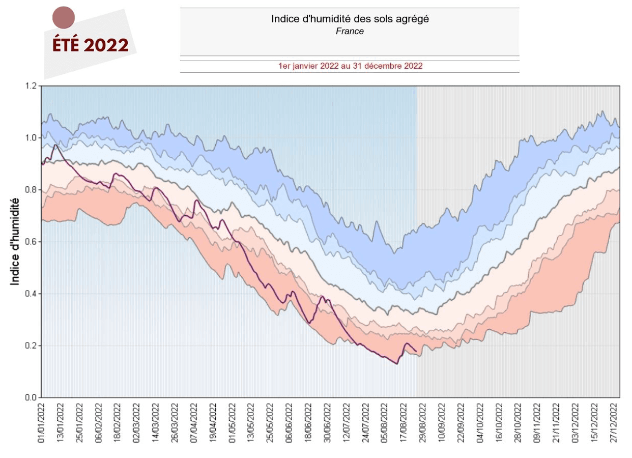 Indice d'humidité des sols observé jusqu'en août 2022 en France - Météo-France