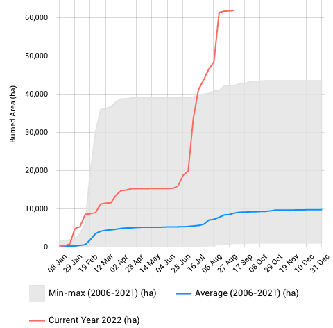 Nombre d'hectares brulés en France sur l'année 2022 (rouge), rapport à la moyenne 2006-2021 (bleu) et record minimal/maximal sur la période 2006-2021 (gris) - EFFIS