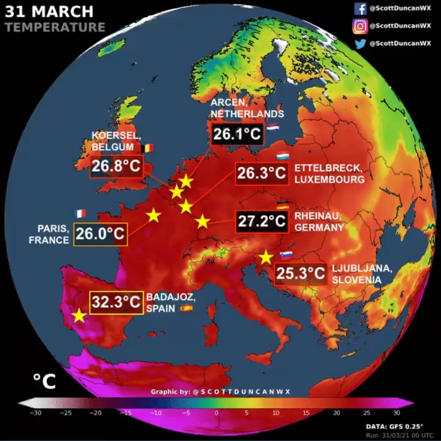 Chaleur exceptionnelle en journée du 31 mars 2021 sur l’Ouest de l’Europe et quelques records associés - Via Scott Duncan