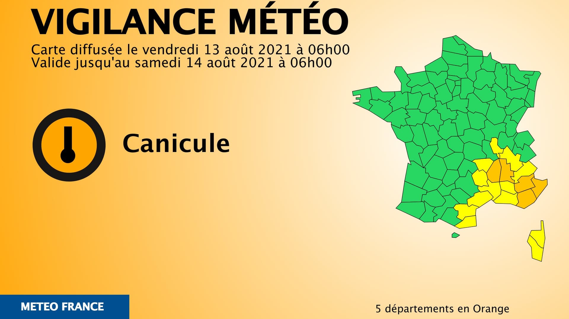 Ainsi, dès le mercredi 11 août, Météo-France plaçait 2 départements du Sud-Est de la France en vigilance orange canicule, à savoir la Drôme et les Alpes-de-Haute-Provence. Le lendemain le Var, les Alpes-Maritimes et l'Ardèche étaient ajoutés à cette vigilance.
