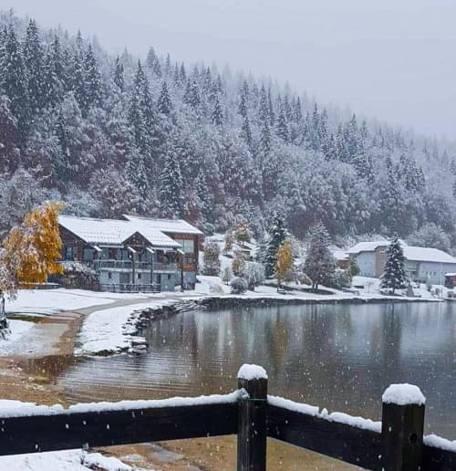 Durant quelques heures en matinée du 26 octobre, les abords du lac des Rousses - situé à 1075 mètres d'altitude dans le département du Jura - se sont parés de couleurs hivernales avec une petite couche de neige au sol par effet d'isothermie, contrastant avec les arbres encore aux couleurs de l'automne.