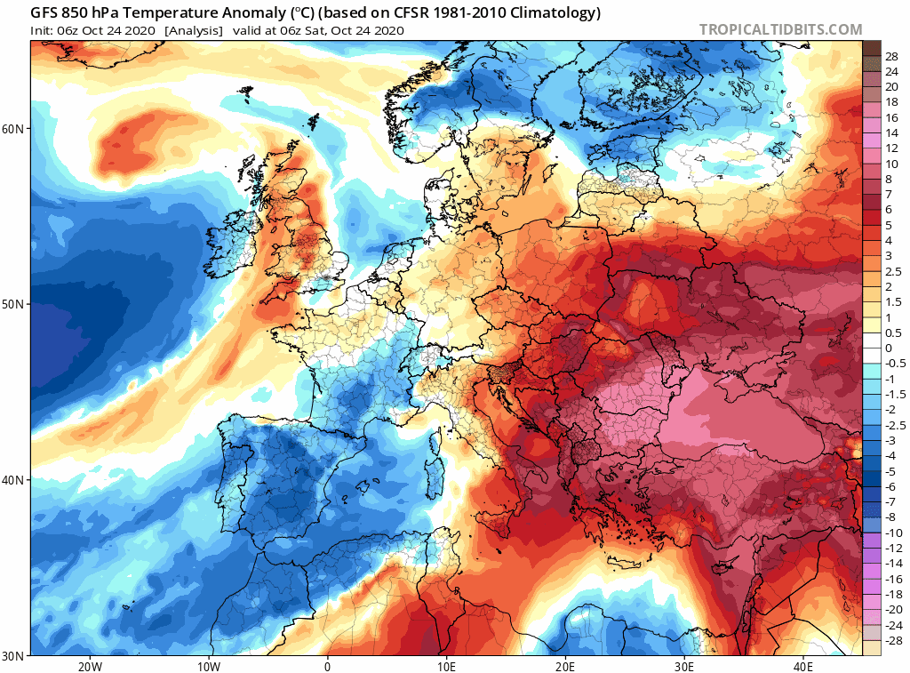 Anomalies thermiques de la masse d'air du samedi 24 au mardi 27 octobre 2020 - via tropicaltidbits.com