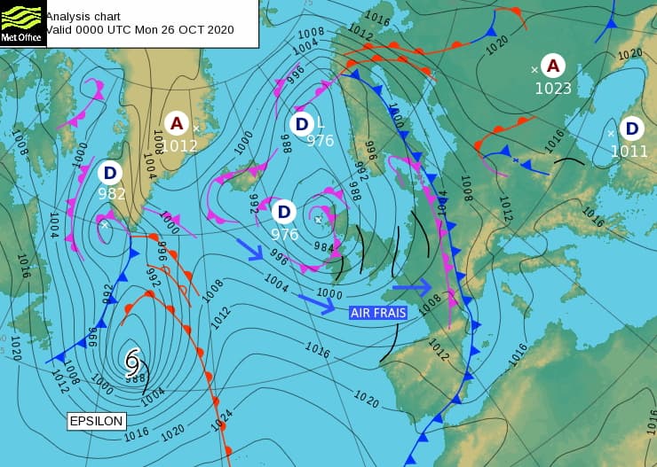 Situation à échelle continentale le lundi 26 octobre 2020 à 00h - via Met Office