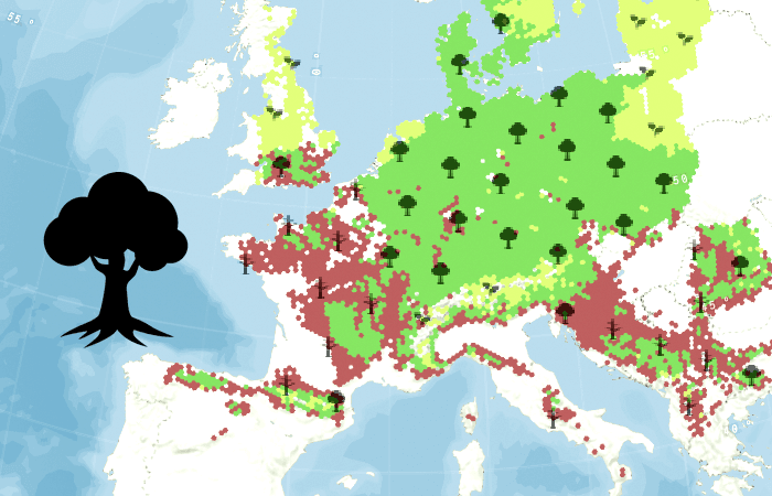 Zones d'implantation du frêne élevé d'ici 2095, sans ralentissement du réchauffement climatique - via @SergeZaka