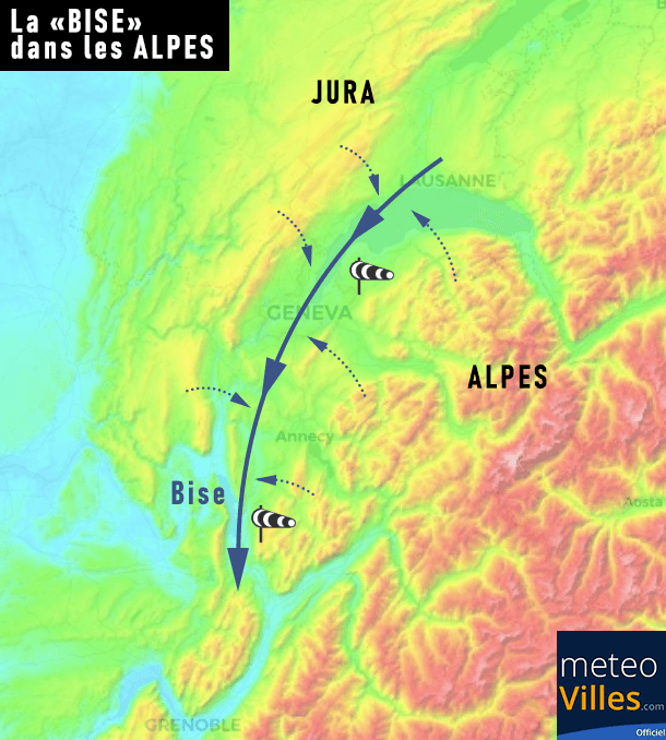 Lorsque la coulée d'air polaire ou continentale descend du Groenland vers la Méditerranée comme cette semaine, la masse froide glisse le long des pentes du Jura ainsi que des Alpes vers le Léman dont la température est très constante été comme hiver : l’air «doux» au-dessus du lac s’élève, ce qui renforce le vent froid polaire descendant des montagnes. Ce vent porte un nom : la "bise".