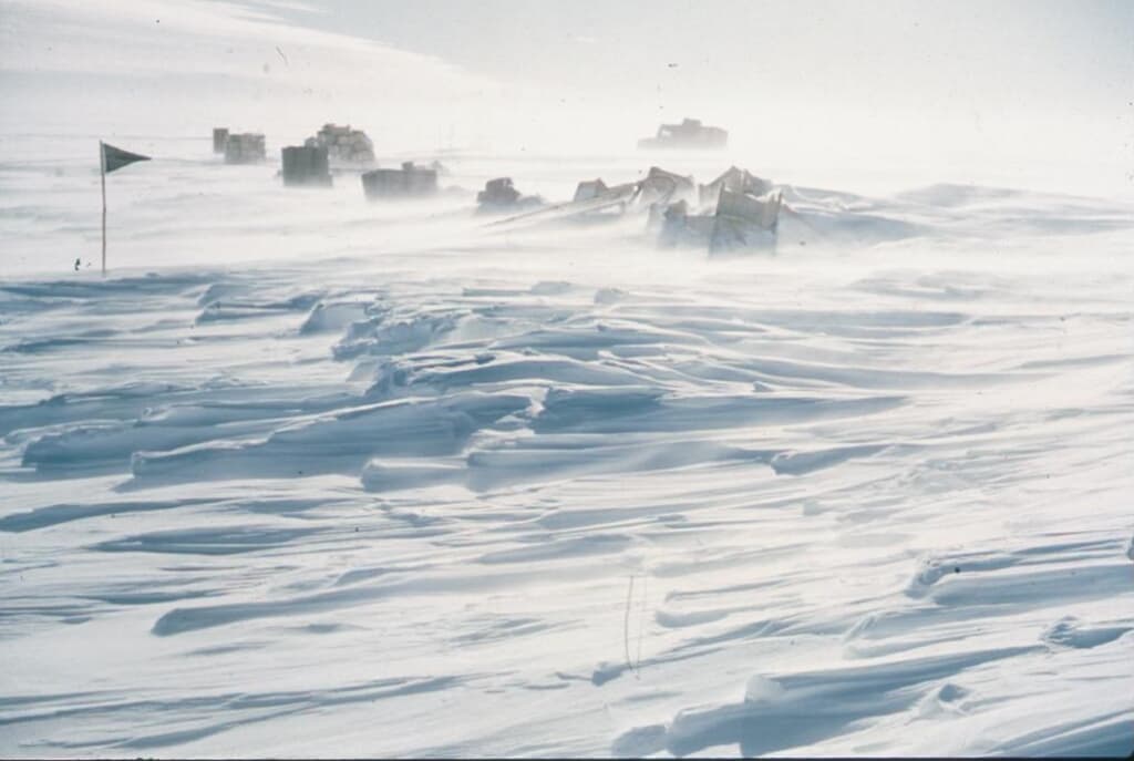 Vent catabatique soufflant sur le dépôt de vivres et de matériels au cours d'un raid en direction de la base Charcot (Antarctique)