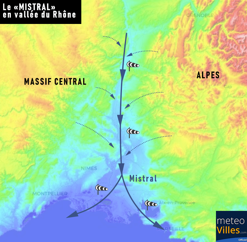 Ce vent catabatique, de secteur Nord, s'écoule le long de la vallée du Rhône, avec un air froid glissant d'une part le long des pentes du Massif-Central à l'Ouest, et des Préalpes à l'Est. Fortement canalisé, il profite alors d'un effet venturi (accélération du flux lorsque la vallée se rétrécit) pour apporter son air froid et se déchainer sur le Gard Rhodanien, sur le Vaucluse ainsi que dans les Bouches-du-Rhône (rafales pouvant dépasser les 130 à 140km/h pour les épisodes les plus importants).