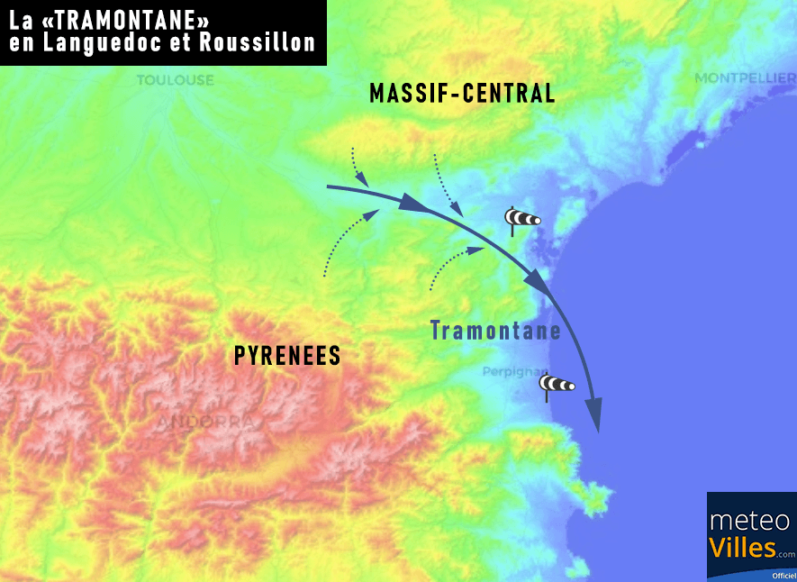 Même fonctionnement, même effet pour un autre vent bien connu : "la tramontane". Ce vent froid voit son origine d'une zone canalisée entre les Pyrénées d'une part et la Montagne Noire (Massif-Central) d'autre part.