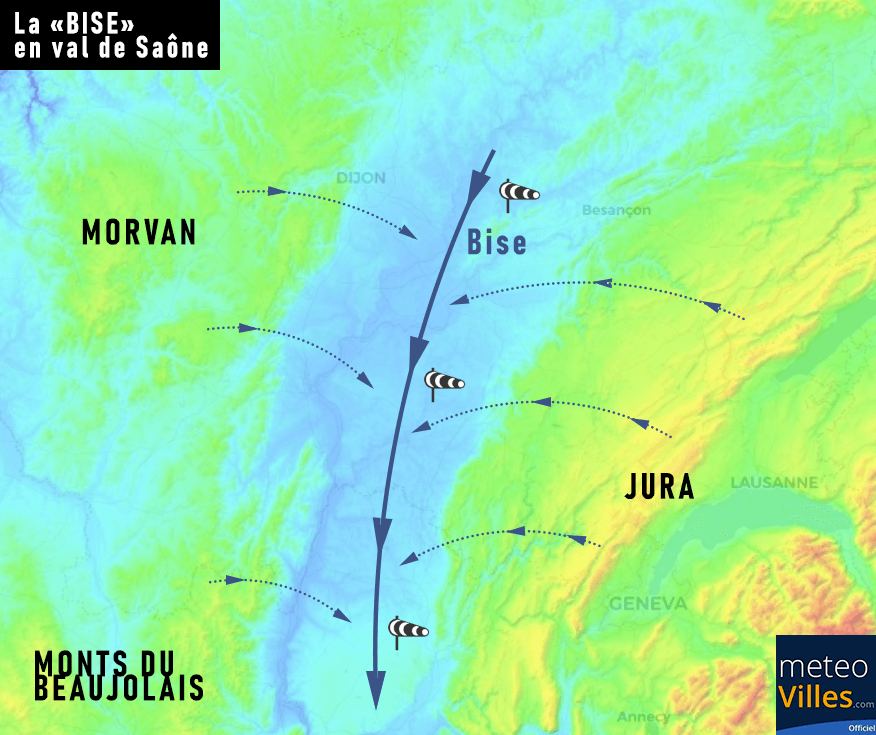 Sur l'autre versant du Jura, la bise est également présente. Elle voit toujours son origine avec la présence d'une masse d'air froid en provenance du Nord de l'Europe, parvenant à glisser sur les pentes du Jura ainsi que depuis le Morvan, pour se cantonner au sein du val de Saône.