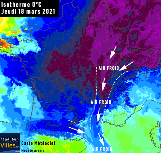 Isohtherme 0°C - jeudi 18 mars 2021 - Modèle Arome via Météociel