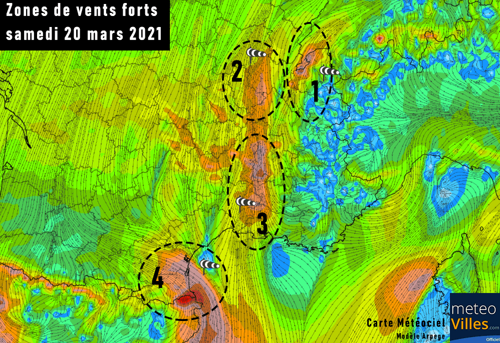Multiples zones de vents forts et froids d'origine "catabatiques" - samedi 20 mars 2021 - Modèle Arpège via Météociel