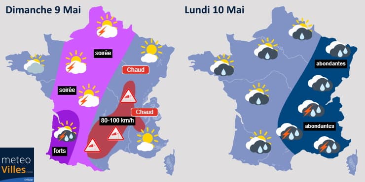 Comme nous l'avons vu plus haut, l'approche de l'air frais océanique déstabilisera la masse d'air dès la journée du dimanche 9 mai. Il faut s'attendre à des déclenchements orageux en fin de journée sur un axe allant du sud-ouest jusqu'à la Belgique. Ces orages pourront être ponctuellement forts avec de la grêle et des rafales de vent, notamment en soirée sur l'Aquitaine. Il conviendra de préciser l'intensité de cette dégradation d'ici là. À l'avant, le vent deviendra violent du domaine de l'autan au Lyonnais et au val de Saône avec des rafales de 80 à 100 km/h !