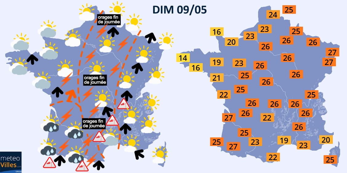 Prévisions du temps et des températures pour le dimanche 9 mai 2021 - Météo Villes
