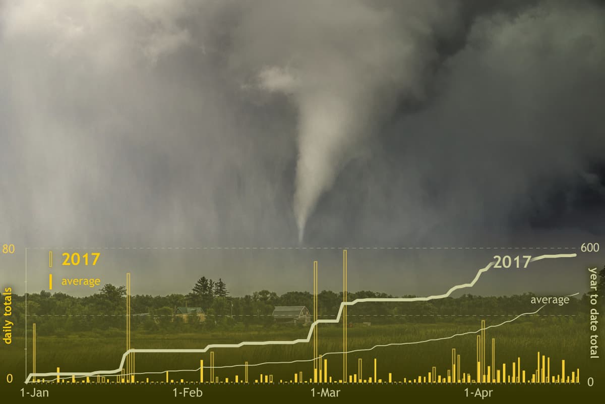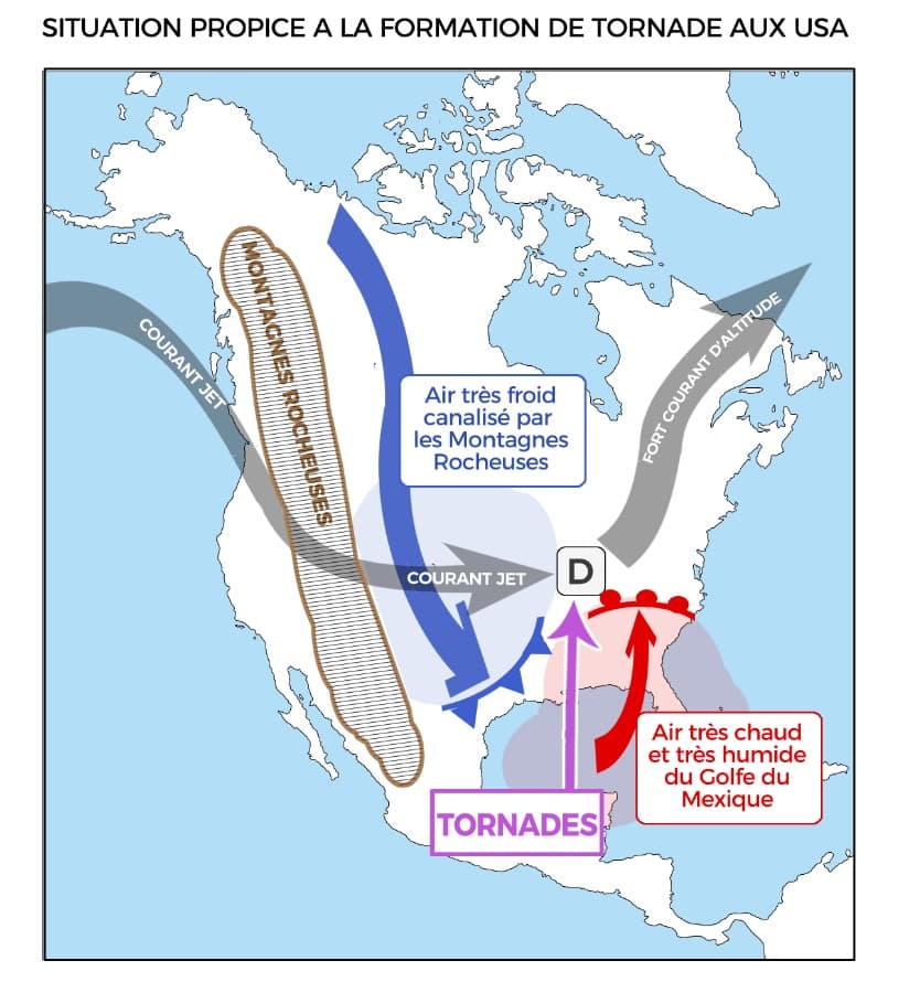 Les États-Unis sont réputés pour être un territoire propice aux tornades, notamment au printemps. À cette saison, les dernières masses d’air sèches et froides descendant des montagnes rocheuses entrent en contact avec de l’air très chaud et humide remontant du Golfe du Mexique. Ce conflit majeur de masses d’air engendre une très forte instabilité et la divergence entre la direction des vents près du sol et celle en altitude est favorable à la formation de supercellules, les orages pouvant être producteurs de tornades.