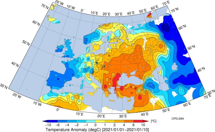 Anomalies thermiques en Europe en première décade de janvier 2021 - via JMA