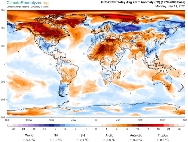 Anomalies thermiques à échelle de la planète le lundi 11 janvier 2021 - via Climate Reanalyzer