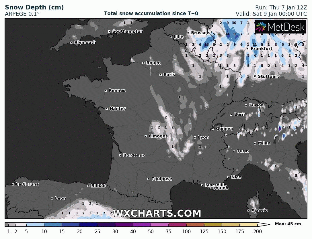 Cumuls de neige en France entre le vendredi 8 et le dimanche 10 janvier 2021 (modèle Arpege) - via wxcharts.com
